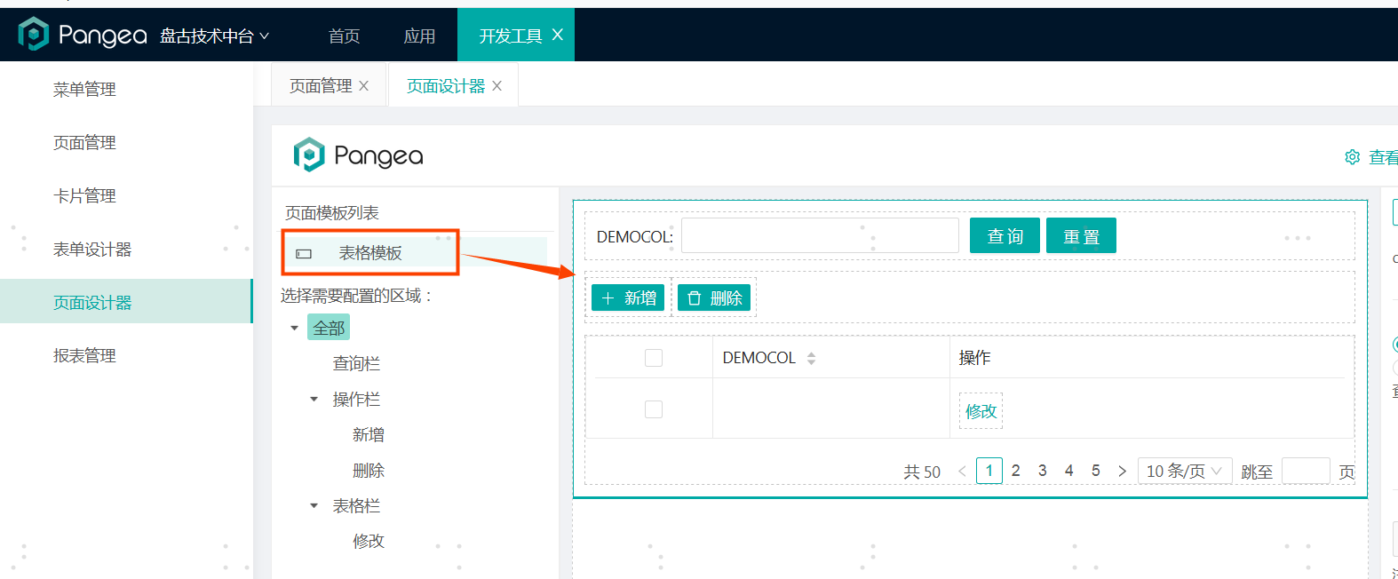 点击页面设计按钮,即可进入到指定的设计器中进行页面的在线设计,以列表设计器为例,将下图中的表格模板拖入到画布区域,画布中会展示表格,点击画布中表格的各个虚线区域,即可对表格的各个区域进行配置。具体配置属性请参见:(连接,待完善)